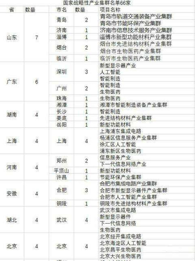 10月29日,據(jù)報(bào)道,近日,國家發(fā)展改革委員會(huì)下發(fā)了《關(guān)于加快推進(jìn)戰(zhàn)略性新興產(chǎn)業(yè)集群建設(shè)有關(guān)工作的通知》。 該通知公布了首批66個(gè)國家戰(zhàn)略性新興產(chǎn)業(yè)集群名單,這些戰(zhàn)略性新興產(chǎn)業(yè)包括新一代信息技術(shù),新材料,生物醫(yī)藥,高端裝備,節(jié)能環(huán)保等。 從該文件公布的產(chǎn)業(yè)集群來看,一共涉及全國23個(gè)省市,其中山東省最多,共獲得7個(gè)產(chǎn)業(yè)集群,青島和煙臺(tái)各兩個(gè),而省會(huì)濟(jì)南只獲得了一個(gè)。其次是廣東省,共獲得了6個(gè)產(chǎn)業(yè)集群,而深圳就占了一半,可見未來深圳的經(jīng)濟(jì)潛力比廣州要明顯得多。 除山東和廣東之外,湖南,河南,湖北,安徽中部四省,都獲得了四個(gè)產(chǎn)業(yè)集群,這足以說明,未來中部的經(jīng)濟(jì)產(chǎn)業(yè)將保持高速增長(zhǎng)。另外,北京和上海兩大直轄市,在加上福建省,都獲得了四個(gè)產(chǎn)業(yè)集群。而浙江和江蘇等沿海城市,則獲得了3個(gè)產(chǎn)業(yè)集群,讓人意外的是,作為江蘇省會(huì)的南京竟然顆粒無收. 另外,從城市產(chǎn)業(yè)集群分布來看,北京,上海,武漢最多,這三個(gè)城市均擁有四個(gè)戰(zhàn)略性產(chǎn)業(yè)集群,值得注意的是,這三個(gè)城市的產(chǎn)業(yè)集群中都包含了集成電路和生物醫(yī)藥,這表明,這兩種產(chǎn)業(yè)將會(huì)成為我國未來產(chǎn)業(yè)重點(diǎn)發(fā)展的方向。 其他城市中,深圳和合肥各有三個(gè)產(chǎn)業(yè)集群獲批,成為除北京上海和武漢外,獲批最多的兩個(gè)城市。其中,合肥的表現(xiàn)最近異常亮眼,國家重大項(xiàng)目一個(gè)接一個(gè)的落地,未來城市產(chǎn)業(yè)和城市科技創(chuàng)新將得到很大提升。 當(dāng)然,每一批國家重點(diǎn)項(xiàng)目下發(fā),都不可能兼顧所有,總是有人歡喜有人憂的。比如,西藏,甘肅,寧夏,山西,廣西,云南,內(nèi)蒙古等省區(qū)無一例外,全部落空,沒有任何項(xiàng)目入選。再比如,南京,沈陽,南昌等省會(huì)城市也沒有入選項(xiàng)目。但愿第二批戰(zhàn)略產(chǎn)業(yè)公布時(shí)候會(huì)兼顧這些城市。