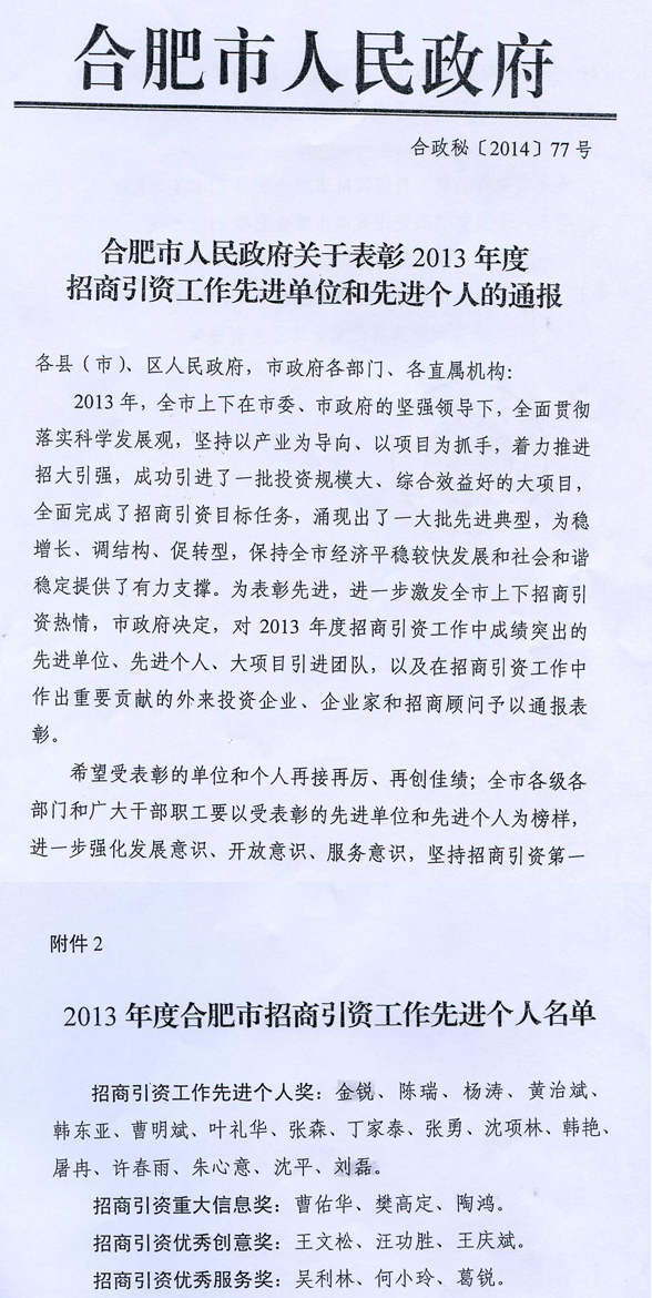 熱烈祝賀我司總裁陶鴻先生在合肥市人民政府招商引資工作先進單位和先進個人評比中,榮獲“招商引資重大信息獎”。
